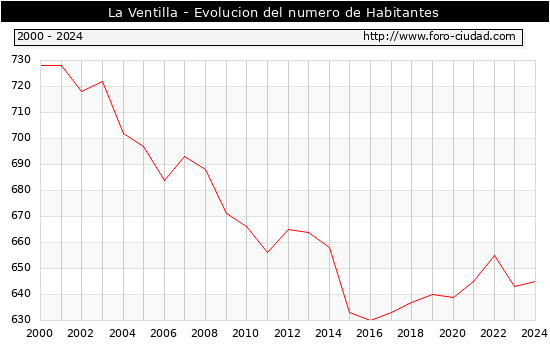 el numero de habitantes en La Ventilla era de 645, 2 habitantes mas que el en el año 2023. En el grafico siguiente se puede ver cuantos habitantes tiene La Ventilla a lo largo de los años.