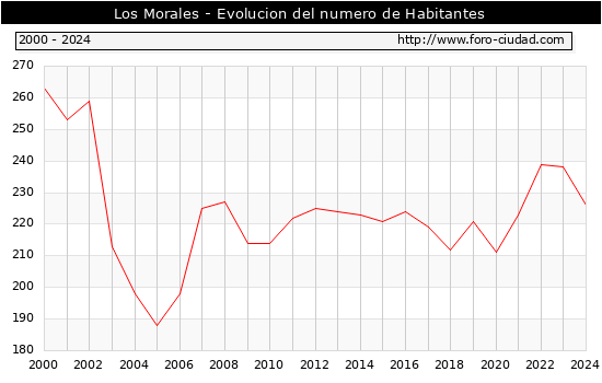 el numero de habitantes en Los Morales era de 226, 12 habitantes menos que el en el año 2023. En el grafico siguiente se puede ver cuantos habitantes tiene Los Morales a lo largo de los años.