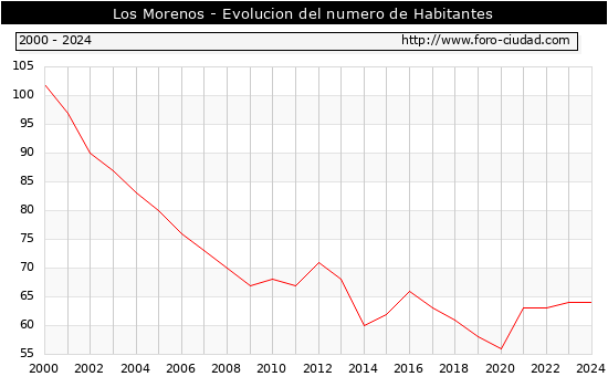 el numero de habitantes en Los Morenos era de 64, igual numero de habitantes que el en el año 2023. En el grafico siguiente se puede ver cuantos habitantes tiene Los Morenos a lo largo de los años.