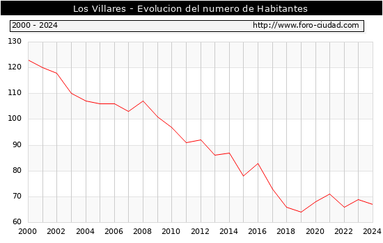 el numero de habitantes en Los Villares era de 67, 2 habitantes menos que el en el año 2023. En el grafico siguiente se puede ver cuantos habitantes tiene Los Villares a lo largo de los años.