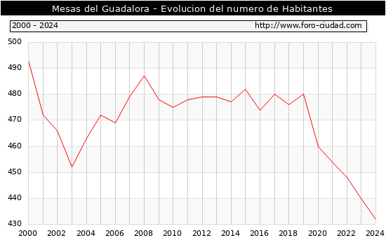 el numero de habitantes en Mesas del Guadalora era de 432, 8 habitantes menos que el en el año 2023. En el grafico siguiente se puede ver cuantos habitantes tiene Mesas del Guadalora a lo largo de los años.