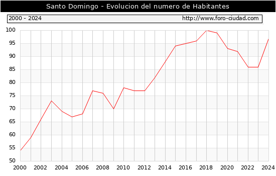 el numero de habitantes en Santo Domingo era de 97, 11 habitantes mas que el en el año 2023. En el grafico siguiente se puede ver cuantos habitantes tiene Santo Domingo a lo largo de los años.