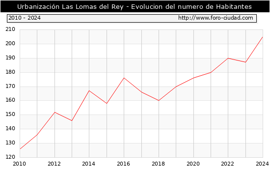 el numero de habitantes en Urbanización Las Lomas del Rey era de 205, 18 habitantes mas que el en el año 2023. En el grafico siguiente se puede ver cuantos habitantes tiene Urbanización Las Lomas del Rey a lo largo de los años.