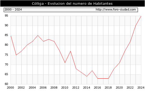 el numero de habitantes en Cólliga era de 95, 5 habitantes mas que el en el año 2023. En el grafico siguiente se puede ver cuantos habitantes tiene Cólliga a lo largo de los años.
