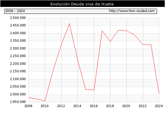 Huete - Deuda viva del Ayuntamiento a 31/12/2024 Huete - Deuda viva del Ayuntamiento a 31/12/2024 Segun el Ministerio de Economia y Hacienda el Ayuntamiento de Huete a 31/12/2024 posee una deuda de 2.001.000 € . La deuda viva a 31/12/2023 ascendia a 2.325.000 € por lo que en el ultimo año la deuda se redujo en -324.000 €. ![]()
