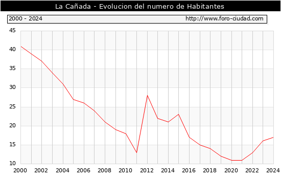 el numero de habitantes en La Cañada era de 17, 1 habitantes mas que el en el año 2023. En el grafico siguiente se puede ver cuantos habitantes tiene La Cañada a lo largo de los años.