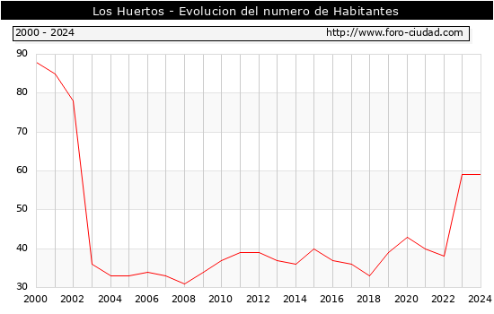 el numero de habitantes en Los Huertos era de 59, igual numero de habitantes que el en el año 2023. En el grafico siguiente se puede ver cuantos habitantes tiene Los Huertos a lo largo de los años.
