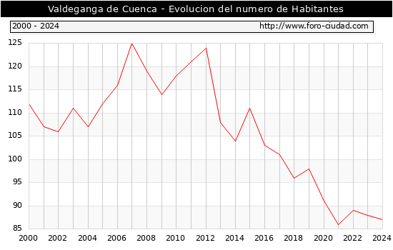 el numero de habitantes en Valdeganga de Cuenca era de 87, 1 habitantes menos que el en el año 2023. En el grafico siguiente se puede ver cuantos habitantes tiene Valdeganga de Cuenca a lo largo de los años.