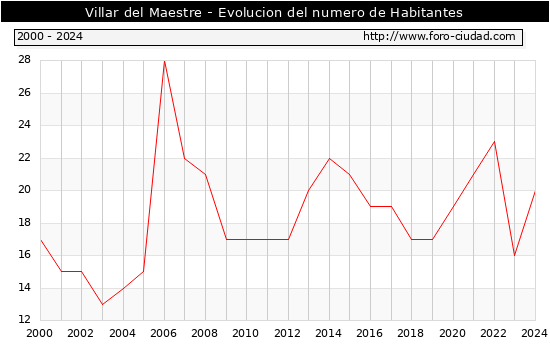 el numero de habitantes en Villar del Maestre era de 20, 4 habitantes mas que el en el año 2023. En el grafico siguiente se puede ver cuantos habitantes tiene Villar del Maestre a lo largo de los años.
