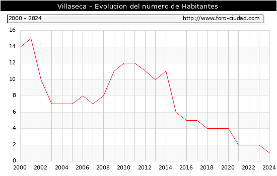 el numero de habitantes en Villaseca era de 1, 1 habitantes menos que el en el año 2023. En el grafico siguiente se puede ver cuantos habitantes tiene Villaseca a lo largo de los años.