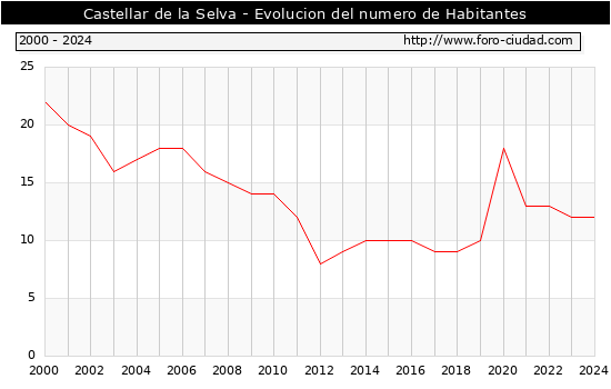 el numero de habitantes en Castellar de la Selva era de 12, igual numero de habitantes que el en el año 2023. En el grafico siguiente se puede ver cuantos habitantes tiene Castellar de la Selva a lo largo de los años.