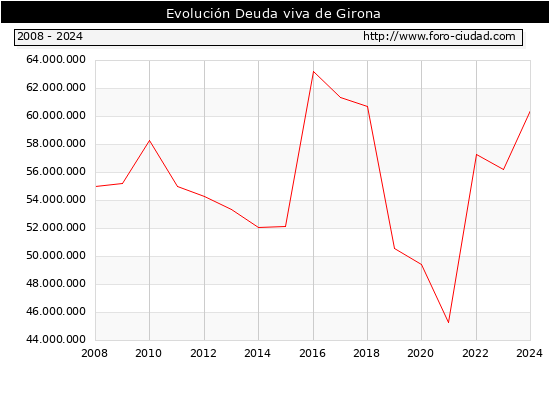 | Girona - Deuda viva del Ayuntamiento a 31/12/2024 Girona - Deuda viva del Ayuntamiento a 31/12/2024 Segun el Ministerio de Economia y Hacienda el Ayuntamiento de Girona a 31/12/2024 posee una deuda de 60.394.000 € . La deuda viva a 31/12/2023 ascendia a 56.240.000 € por lo que en el ultimo año la deuda crecio en 4.154.000 €.