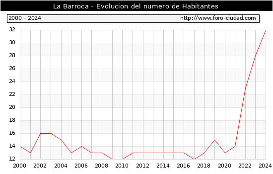 el numero de habitantes en La Barroca era de 32, 4 habitantes mas que el en el año 2023. En el grafico siguiente se puede ver cuantos habitantes tiene La Barroca a lo largo de los años.