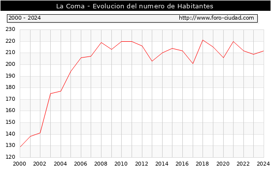 el numero de habitantes en La Coma era de 212, 3 habitantes mas que el en el año 2023. En el grafico siguiente se puede ver cuantos habitantes tiene La Coma a lo largo de los años.