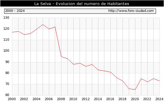 el numero de habitantes en La Selva era de 73, 2 habitantes menos que el en el año 2023. En el grafico siguiente se puede ver cuantos habitantes tiene La Selva a lo largo de los años.