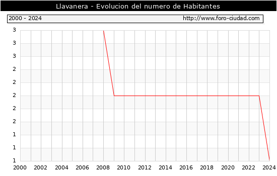 el numero de habitantes en Llavanera era de 1, 1 habitantes menos que el en el año 2023. En el grafico siguiente se puede ver cuantos habitantes tiene Llavanera a lo largo de los años.