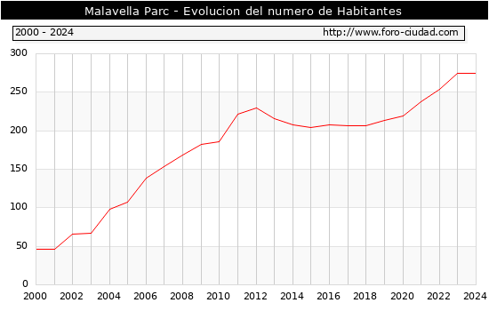 el numero de habitantes en Malavella Parc era de 275, igual numero de habitantes que el en el año 2023. En el grafico siguiente se puede ver cuantos habitantes tiene Malavella Parc a lo largo de los años.