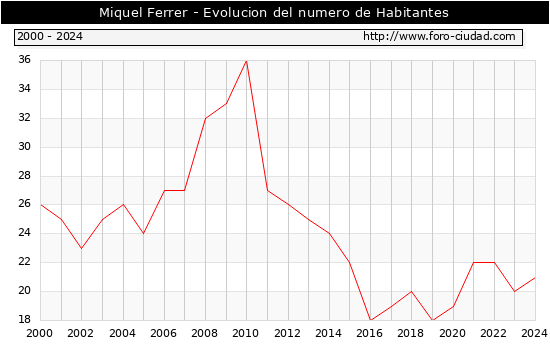 el numero de habitantes en Miquel Ferrer era de 21, 1 habitantes mas que el en el año 2023. En el grafico siguiente se puede ver cuantos habitantes tiene Miquel Ferrer a lo largo de los años.
