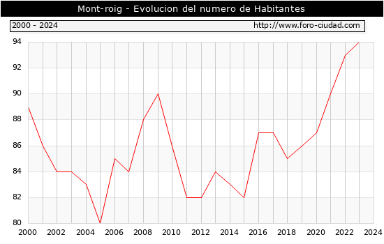 el numero de habitantes en Mont-roig era de 94, igual numero de habitantes que el en el año 2023. En el grafico siguiente se puede ver cuantos habitantes tiene Mont-roig a lo largo de los años.