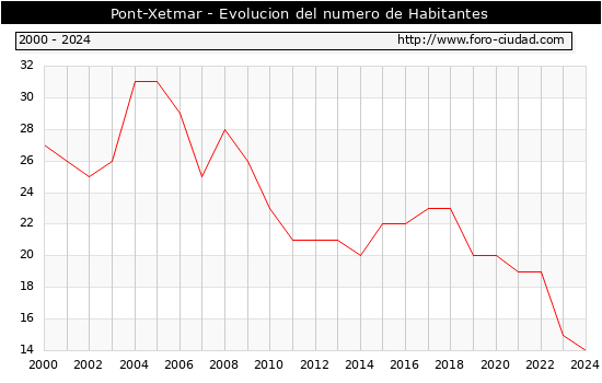 el numero de habitantes en Pont-Xetmar era de 14, 1 habitantes menos que el en el año 2023. En el grafico siguiente se puede ver cuantos habitantes tiene Pont-Xetmar a lo largo de los años.