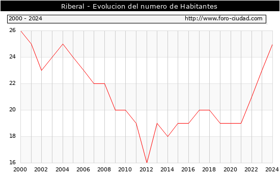 el numero de habitantes en Riberal era de 25, 2 habitantes mas que el en el año 2023. En el grafico siguiente se puede ver cuantos habitantes tiene Riberal a lo largo de los años.