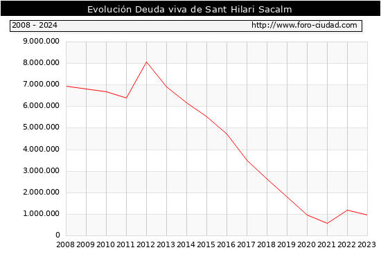 Sant Hilari Sacalm - Deuda viva del Ayuntamiento a 31/12/2024 Sant Hilari Sacalm - Deuda viva del Ayuntamiento a 31/12/2024 Segun el Ministerio de Economia y Hacienda el Ayuntamiento de Sant Hilari Sacalm a 31/12/2024 posee una deuda de 2.572.000 € . La deuda viva a 31/12/2023 ascendia a 960.000 € por lo que en el ultimo año la deuda crecio en 1.612.000 €. ![]()