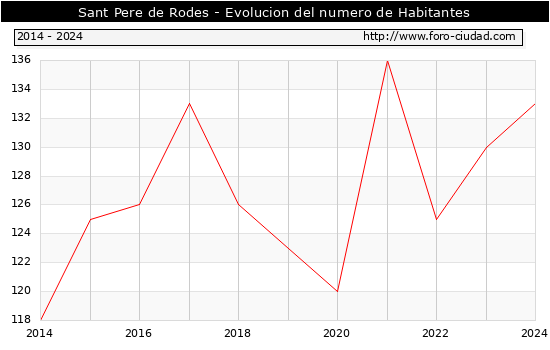 el numero de habitantes en Sant Pere de Rodes era de 133, 3 habitantes mas que el en el año 2023. En el grafico siguiente se puede ver cuantos habitantes tiene Sant Pere de Rodes a lo largo de los años.