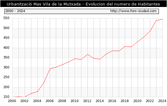 el numero de habitantes en Urbanització Mas Vila de la Mutxada era de 545, 5 habitantes mas que el en el ańo 2023. En el grafico siguiente se puede ver cuantos habitantes tiene Urbanització Mas Vila de la Mutxada a lo largo de los ańos.