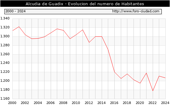 el numero de habitantes en Alcudia de Guadix era de 1.207, 4 habitantes menos que el en el año 2023. En el grafico siguiente se puede ver cuantos habitantes tiene Alcudia de Guadix a lo largo de los años.