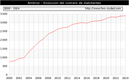 el numero de habitantes en Ambroz era de 3.408, 18 habitantes mas que el en el año 2023. En el grafico siguiente se puede ver cuantos habitantes tiene Ambroz a lo largo de los años.