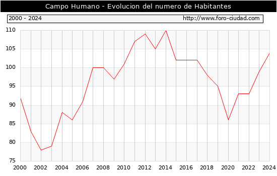 el numero de habitantes en Campo Humano era de 104, 5 habitantes mas que el en el año 2023. En el grafico siguiente se puede ver cuantos habitantes tiene Campo Humano a lo largo de los años.