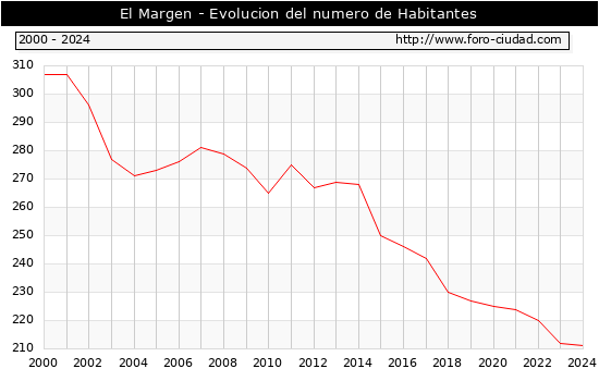 el numero de habitantes en El Margen era de 211, 1 habitantes menos que el en el año 2023. En el grafico siguiente se puede ver cuantos habitantes tiene El Margen a lo largo de los años.