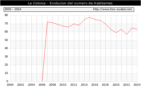 el numero de habitantes en La Colonia era de 63, 2 habitantes menos que el en el año 2023. En el grafico siguiente se puede ver cuantos habitantes tiene La Colonia a lo largo de los años.