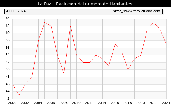 el numero de habitantes en La Paz era de 57, 4 habitantes menos que el en el año 2023. En el grafico siguiente se puede ver cuantos habitantes tiene La Paz a lo largo de los años.