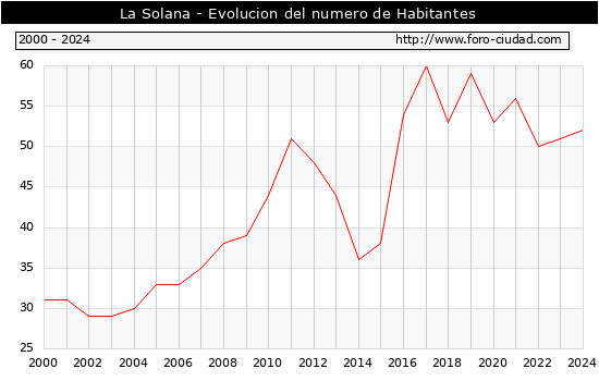 el numero de habitantes en La Solana era de 52, 1 habitantes mas que el en el año 2023. En el grafico siguiente se puede ver cuantos habitantes tiene La Solana a lo largo de los años.