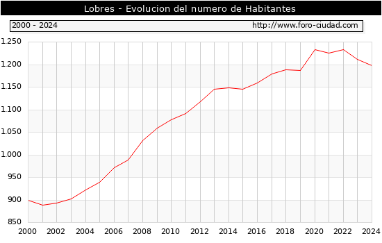 el numero de habitantes en Lobres era de 1.198, 13 habitantes menos que el en el año 2023. En el grafico siguiente se puede ver cuantos habitantes tiene Lobres a lo largo de los años.