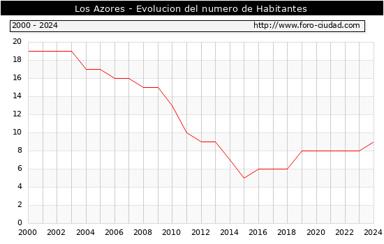 el numero de habitantes en Los Azores era de 9, 1 habitantes mas que el en el año 2023. En el grafico siguiente se puede ver cuantos habitantes tiene Los Azores a lo largo de los años.