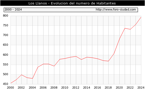 Segun los datos publicados por el INE a 1 de Enero de 2024 el numero de habitantes en Los Llanos era de 795, 40 habitantes mas que el en el año 2023. En el grafico siguiente se puede ver cuantos habitantes tiene Los Llanos a lo largo de los años.