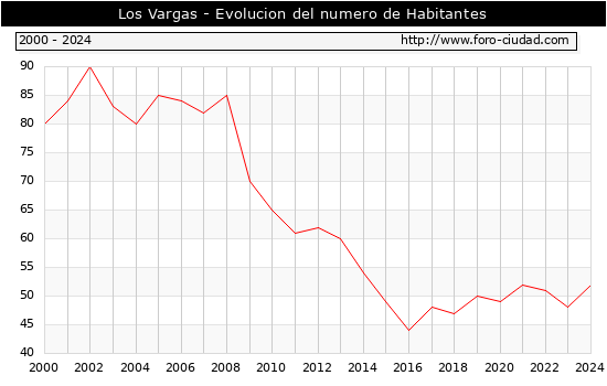 el numero de habitantes en Los Vargas era de 52, 4 habitantes mas que el en el año 2023. En el grafico siguiente se puede ver cuantos habitantes tiene Los Vargas a lo largo de los años.