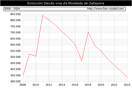Moraleda de Zafayona - Deuda viva del Ayuntamiento a 31/12/2024 Moraleda de Zafayona - Deuda viva del Ayuntamiento a 31/12/2024 Segun el Ministerio de Economia y Hacienda el Ayuntamiento de Moraleda de Zafayona a 31/12/2024 posee una deuda de 336.000 € . La deuda viva a 31/12/2023 ascendia a 389.000 € por lo que en el ultimo año la deuda se redujo en -53.000 €. ![]()