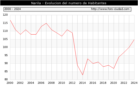 Segun los datos publicados por el INE a 1 de Enero de 2024 el numero de habitantes en Narila era de 105, 5 habitantes mas que el en el año 2023. En el grafico siguiente se puede ver cuantos habitantes tiene Narila a lo largo de los años.