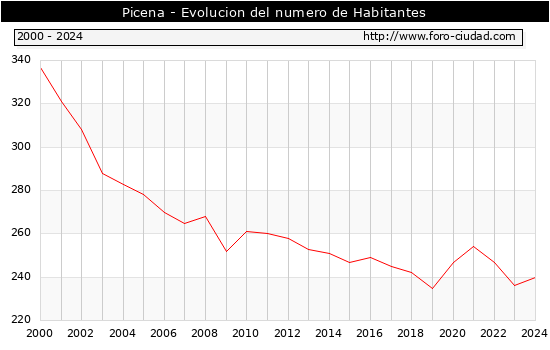 el numero de habitantes en Picena era de 240, 4 habitantes mas que el en el año 2023. En el grafico siguiente se puede ver cuantos habitantes tiene Picena a lo largo de los años.