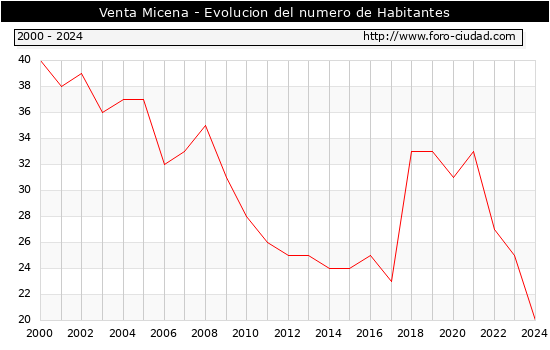 el numero de habitantes en Venta Micena era de 20, 5 habitantes menos que el en el año 2023. En el grafico siguiente se puede ver cuantos habitantes tiene Venta Micena a lo largo de los años.