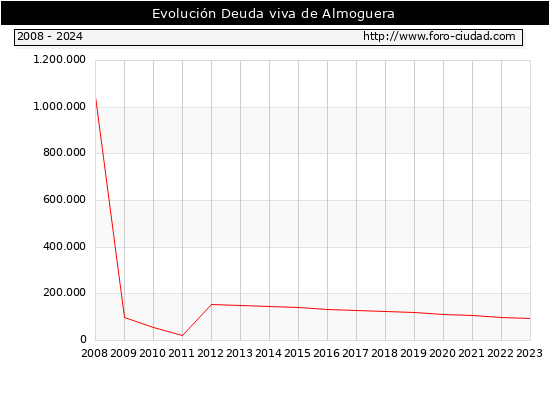 Almoguera - Deuda viva del Ayuntamiento a 31/12/2024 Almoguera - Deuda viva del Ayuntamiento a 31/12/2024 Segun el Ministerio de Economia y Hacienda el Ayuntamiento de Almoguera a 31/12/2024 posee una deuda de 89.000 € . La deuda viva a 31/12/2023 ascendia a 94.000 € por lo que en el ultimo año la deuda se redujo en -5.000 €. ![]()