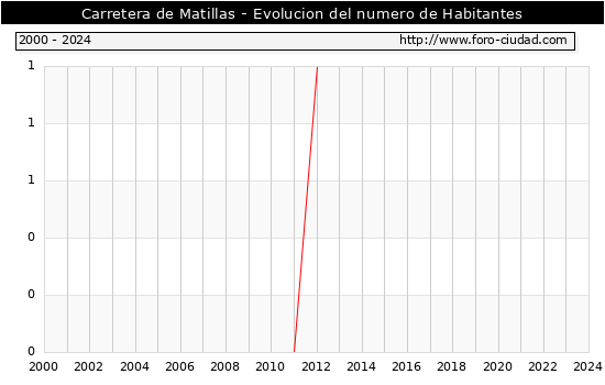 el numero de habitantes en Carretera de Matillas era de 1, igual numero de habitantes que el en el año 2023. En el grafico siguiente se puede ver cuantos habitantes tiene Carretera de Matillas a lo largo de los años.