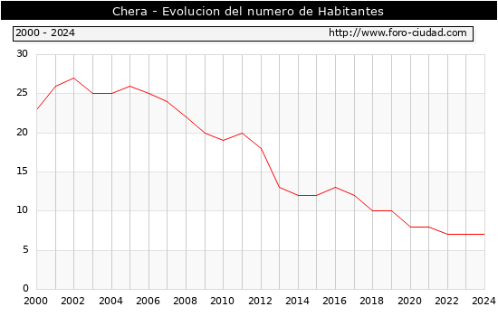 Segun los datos publicados por el INE a 1 de Enero de 2024 el numero de habitantes en Chera era de 7, igual numero de habitantes que el en el año 2023. En el grafico siguiente se puede ver cuantos habitantes tiene Chera a lo largo de los años.
