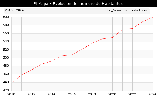 el numero de habitantes en El Mapa era de 600, 11 habitantes mas que el en el año 2023. En el grafico siguiente se puede ver cuantos habitantes tiene El Mapa a lo largo de los años.