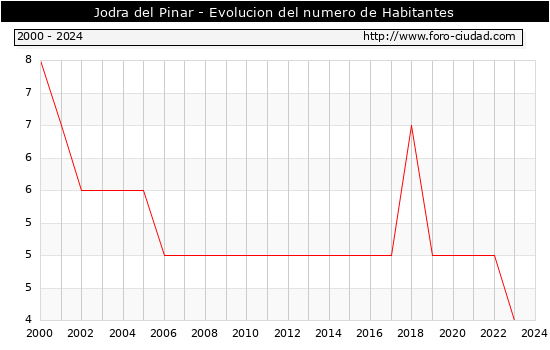 el numero de habitantes en Jodra del Pinar era de 4, igual numero de habitantes que el en el año 2023. En el grafico siguiente se puede ver cuantos habitantes tiene Jodra del Pinar a lo largo de los años.