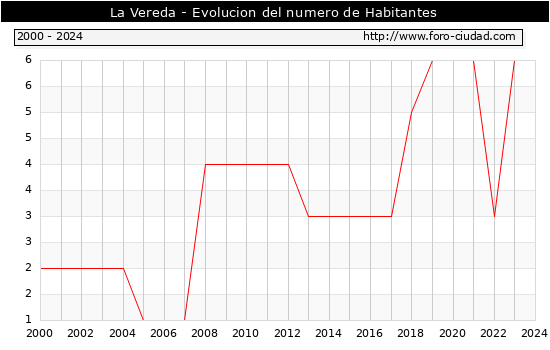 Segun los datos publicados por el INE a 1 de Enero de 2024 el numero de habitantes en La Vereda era de 6, igual numero de habitantes que el en el año 2023. En el grafico siguiente se puede ver cuantos habitantes tiene La Vereda a lo largo de los años.