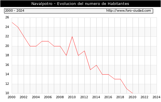 el numero de habitantes en Navalpotro era de 10, igual numero de habitantes que el en el año 2023. En el grafico siguiente se puede ver cuantos habitantes tiene Navalpotro a lo largo de los años.